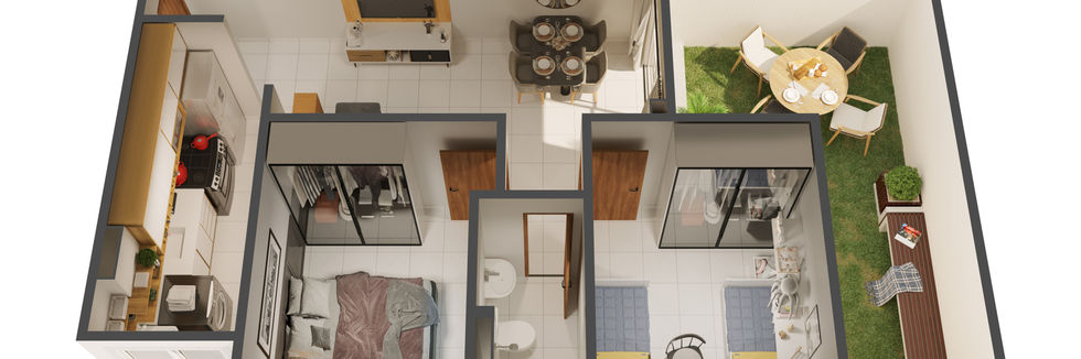 02 Quartos;   Sala de Estar/   Jantar;   Cozinha/   Área de serviço;   Varanda. Opções com vaga de garagem para moto ou carro.
