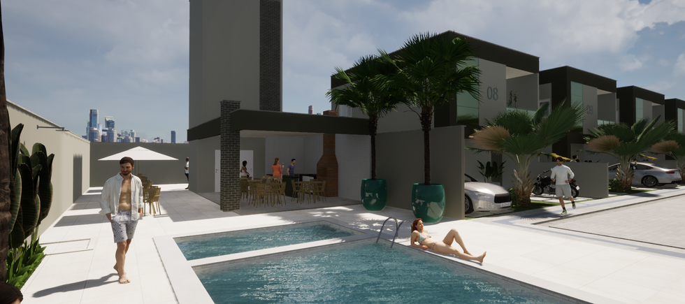 A área de lazer: Formada por ✔ Piscina adulto e infantil; ✔ Salão de festas com churrasqueira e banheiros;